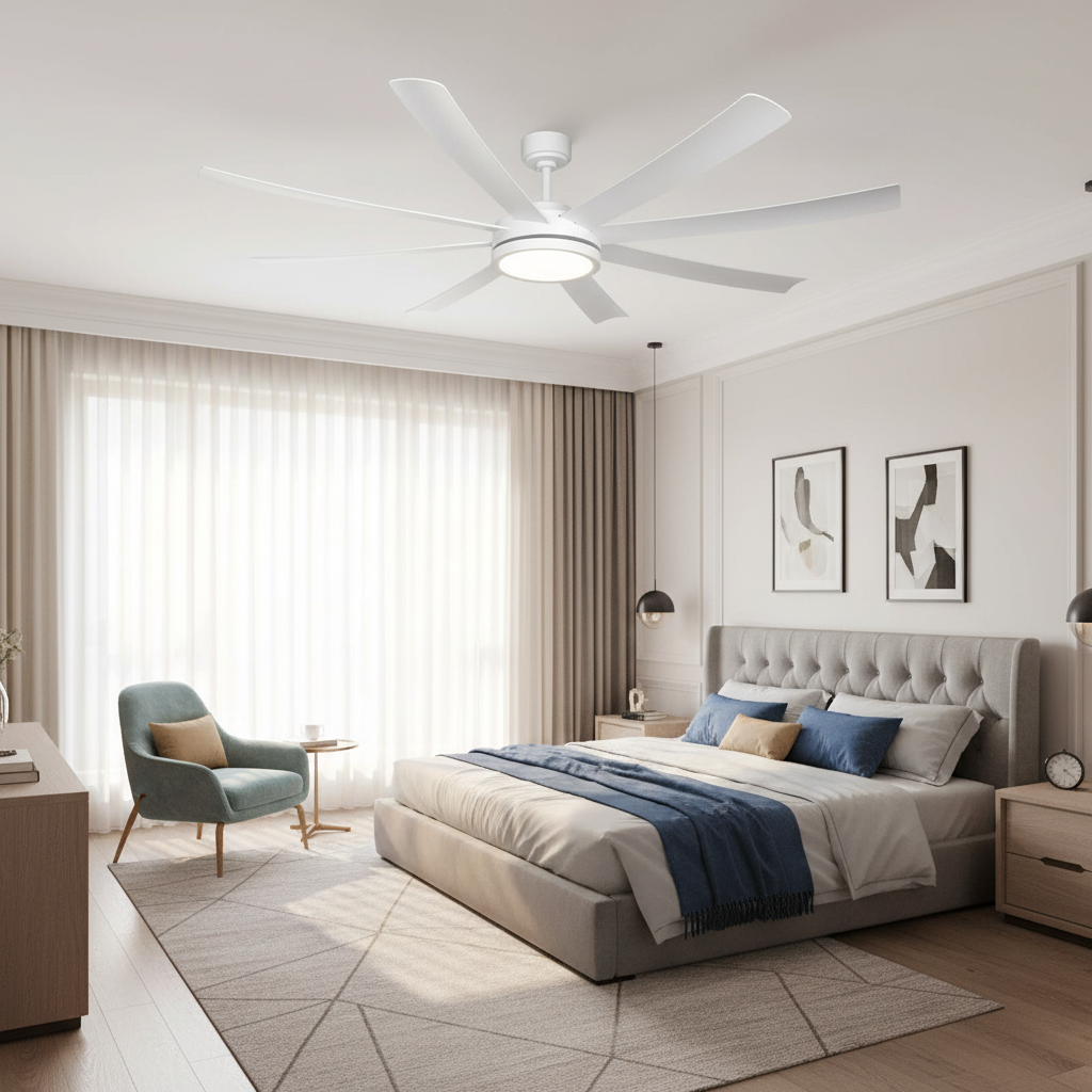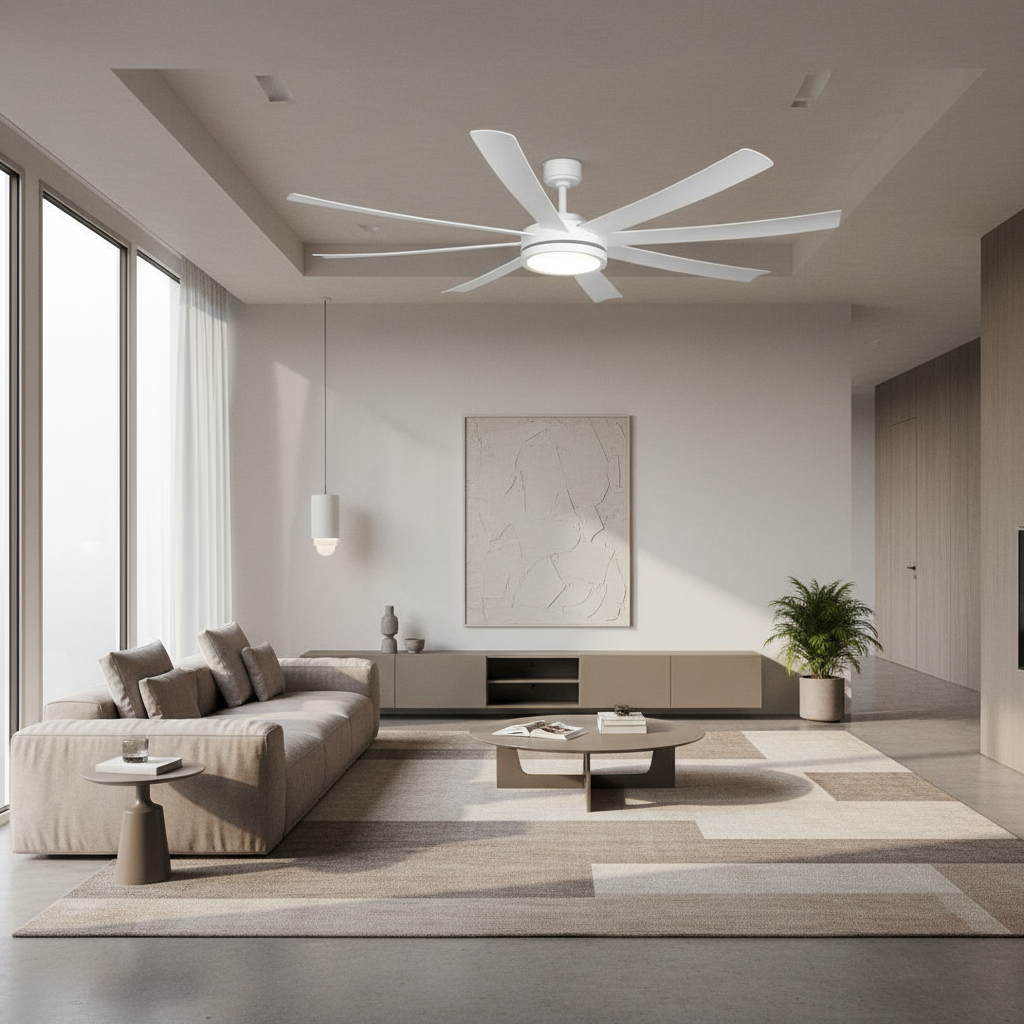 Notre modèle combine des matériaux robustes comme l'ABS et le fer pour une durabilité accrue. Avec son diamètre généreux de 186 cm et ses trois pales discrètes, il est idéal pour les grands salons, chambres, bureaux ou salles de réunion. L'éclairage intégré, puissant de 2000 à 82000 lumens, et la télécommande incluse garantissent un contrôle total de votre ambiance.- Ventilation efficace pour un confort thermique optimal dans les vastes pièces.