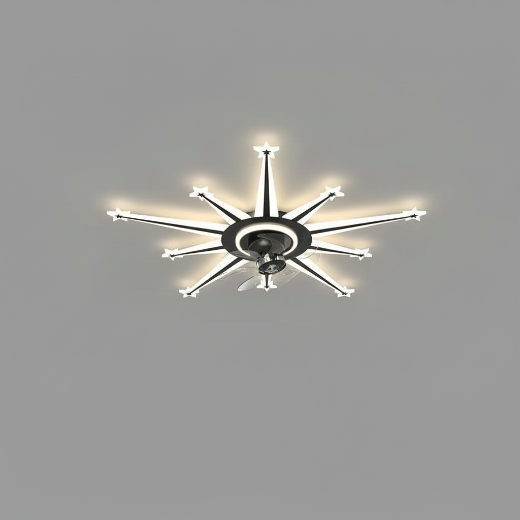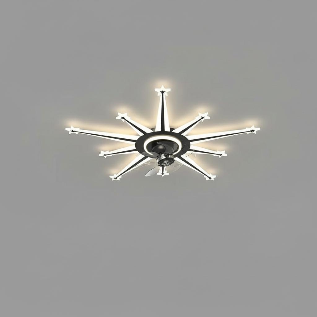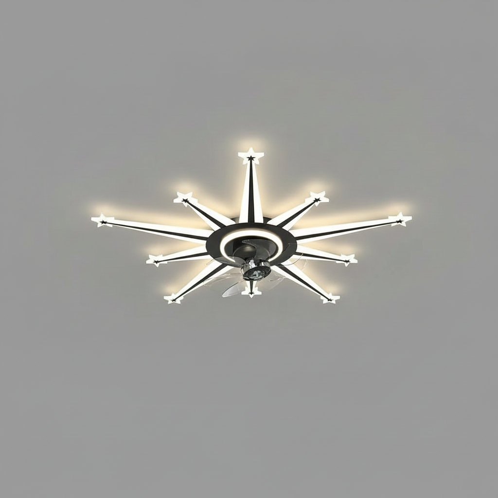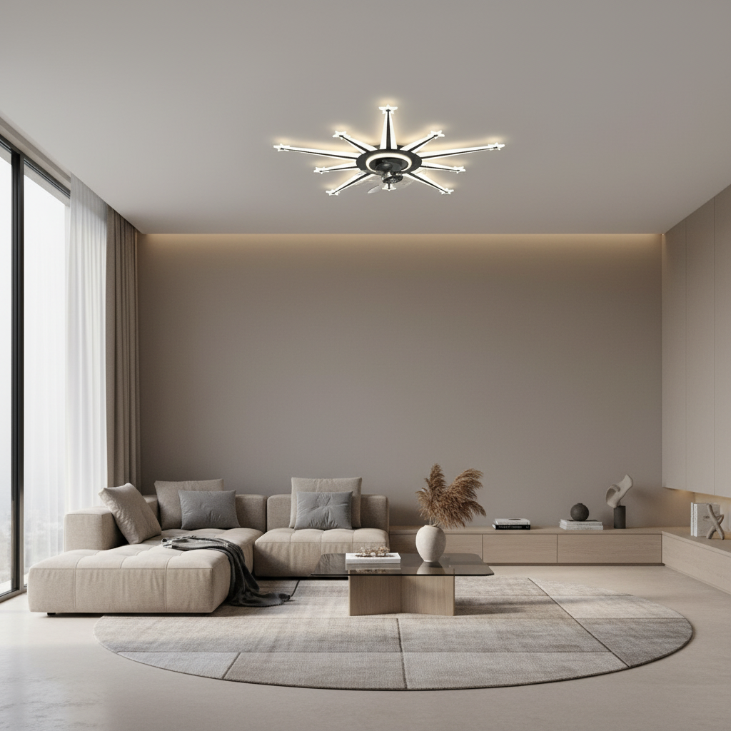 Ce lustre ventilateur combine fer, verre et acrylique pour un style moderne. Mesurant 1050 mm de diamètre et 260 mm de hauteur, il convient aux pièces de 15 à 20 m² (salon, salle à manger, chambre). Son éclairage LED intégré est dimmable, et ses pales de 30cm sont discrètement rétractables.