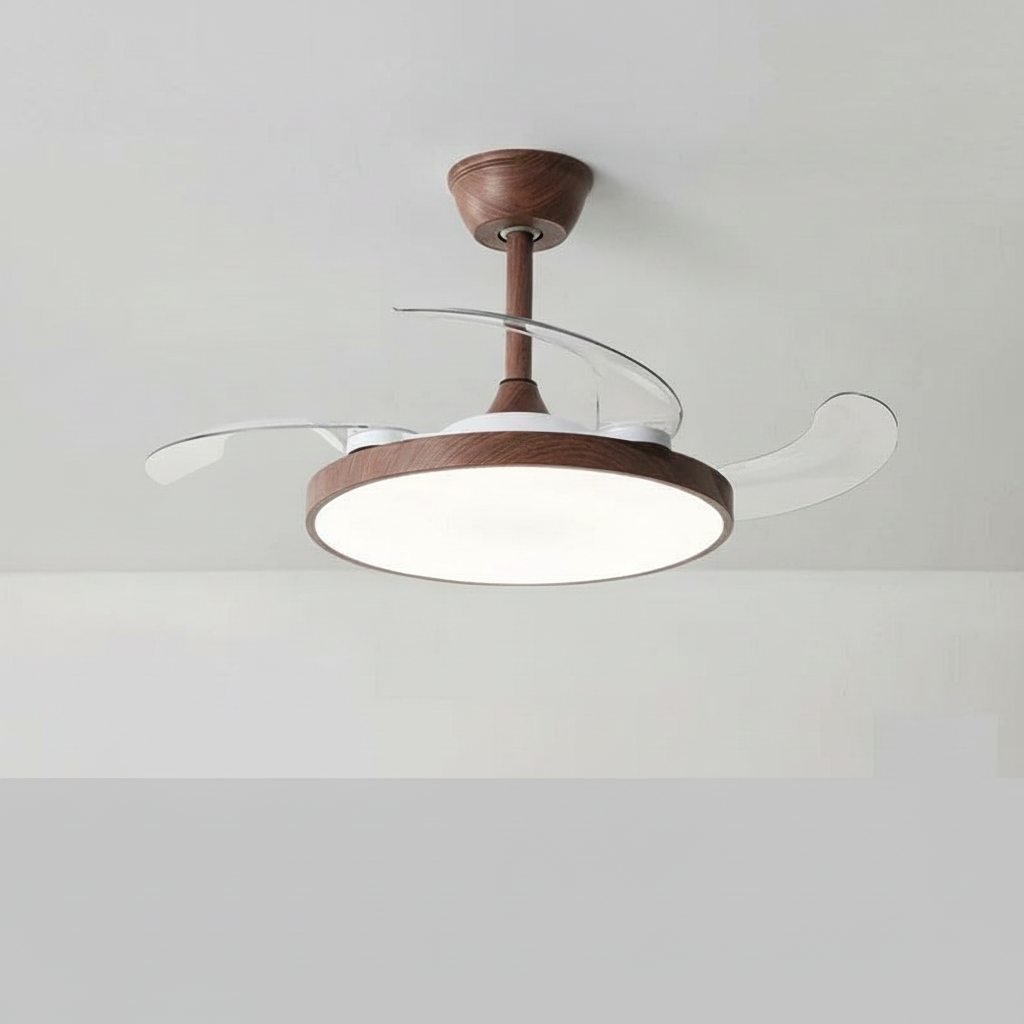 Ce modèle, en fer et acrylique robustes, présente un diamètre de 48 cm. Il intègre un éclairage LED 60W tri-couleur, non dimmable, avec une durée de vie de 50 000 heures. Ses pales sont rétractables pour une esthétique épurée, et l'ensemble est contrôlable par télécommande. Idéal pour salons, chambres, salles à manger ou bureaux.