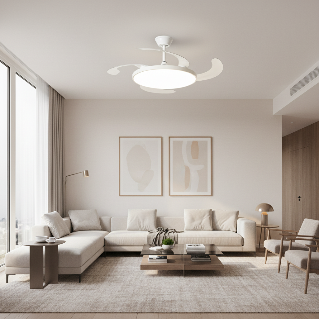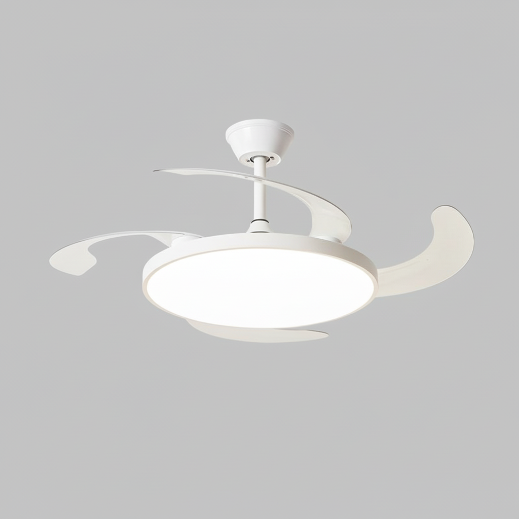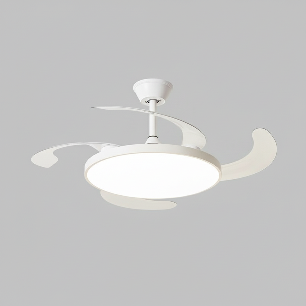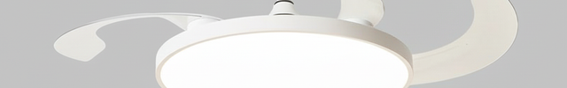 Fabriqué en fer et acrylique, ce modèle intègre un éclairage LED de 60W avec lumière tricolore (chaud, neutre, froid), non dimmable. Le corps de la lampe (D48cm, H14cm) et ses pales, déployées jusqu'à 121cm, assurent une ventilation silencieuse. Pilotable par télécommande, il convient aux pièces de 8 à 15 m².