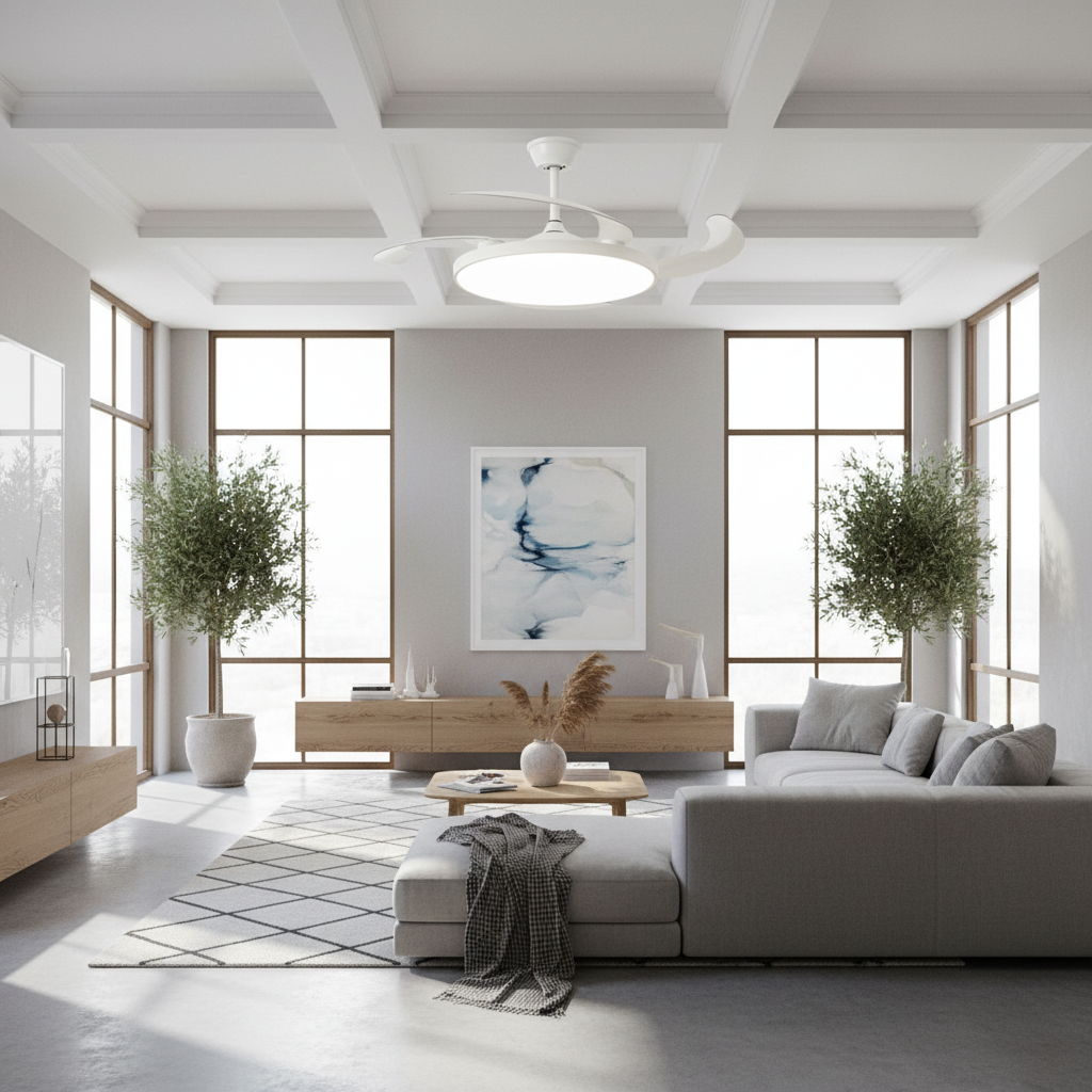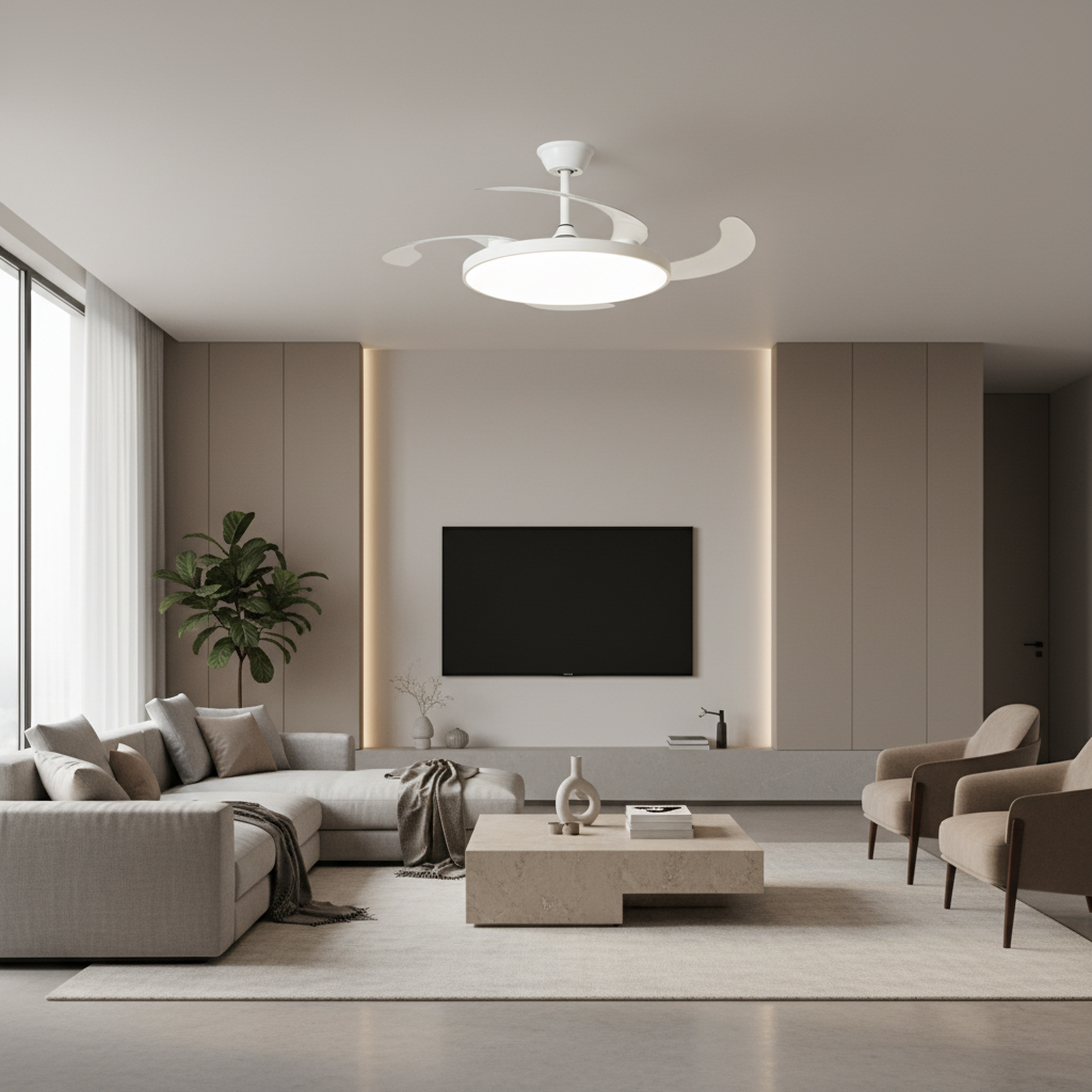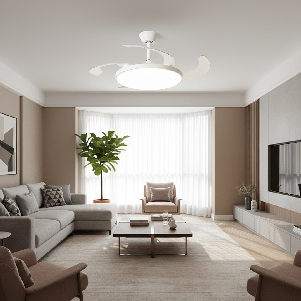 Fabriqué en fer et acrylique, ce modèle intègre un éclairage LED de 60W avec lumière tricolore (chaud, neutre, froid), non dimmable. Le corps de la lampe (D48cm, H14cm) et ses pales, déployées jusqu'à 121cm, assurent une ventilation silencieuse. Pilotable par télécommande, il convient aux pièces de 8 à 15 m².