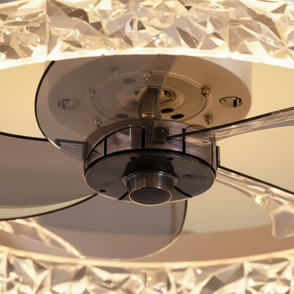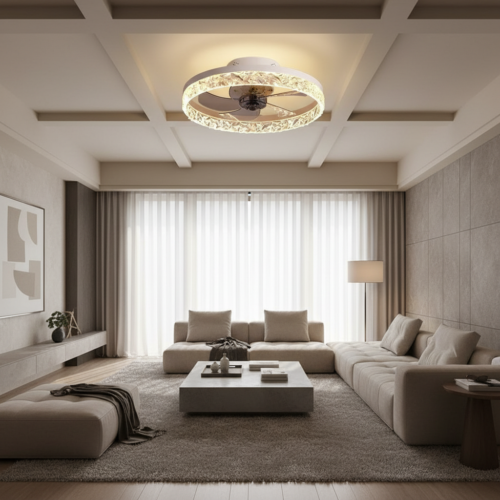 Conçu avec un corps en fer robuste, ce lustre ventilateur intègre des pales escamotables discrètes et des accents cristal pour un style moderne et épuré. Il offre un éclairage LED intégré efficace, non dimmable, gérable à distance via sa télécommande pratique, idéal pour diffuser une lumière agréable et une brise rafraîchissante dans votre salon, chambre ou salle à manger.- Corps en fer robuste et design moderne avec accents cristal.