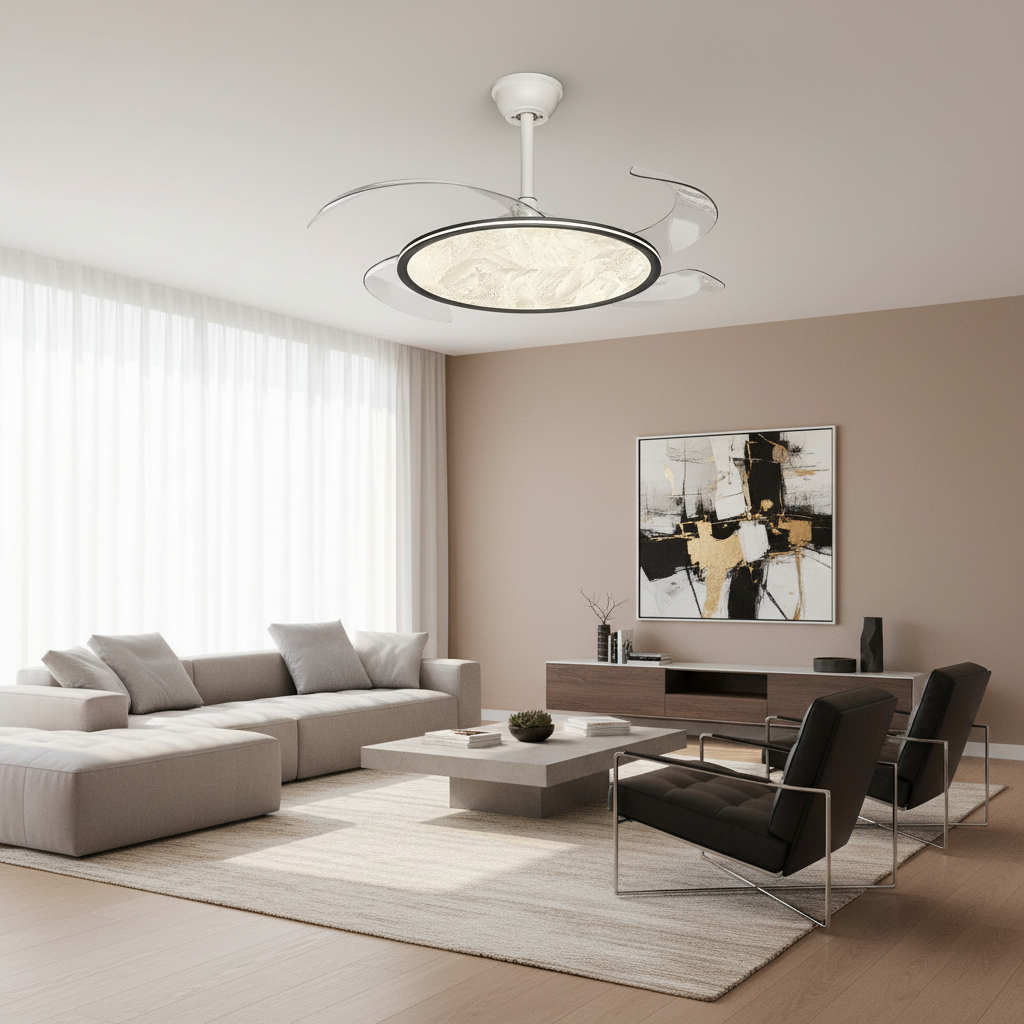 Fabriqué en fer robuste, ce ventilateur de plafond lumineux moderne est idéal pour 11 à 18 m² (D50xH33cm). Il intègre une source LED puissante (55W lumière, 30W ventilateur) et offre des températures de couleur ajustables et une intensité lumineuse dimmable via télécommande.- Ventilation efficace avec pales transparentes rétractables, invisibles au repos.