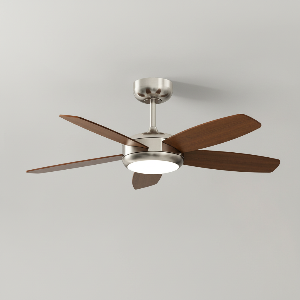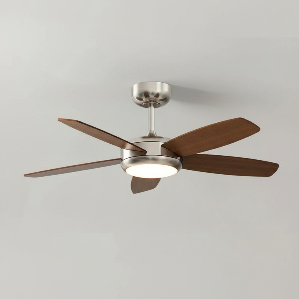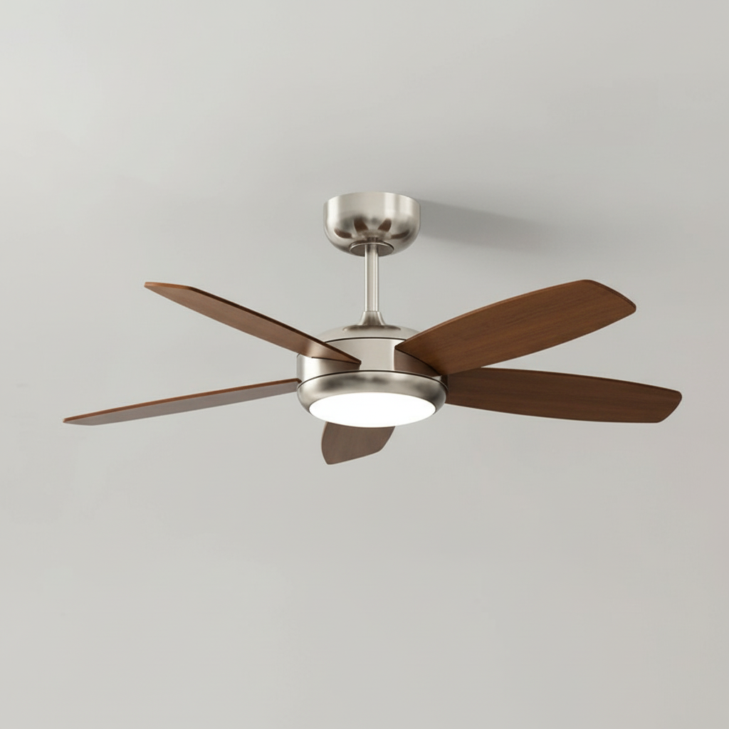 Ce lustre ventilateur arbore un style contemporain, combinant métal brossé et cinq pales en bois. Il intègre une lumière LED unique (ampoule incluse, non dimmable). Le contrôle s'effectue via un interrupteur mural tactile.- Ventilation efficace et silencieuse pour un confort optimal.
