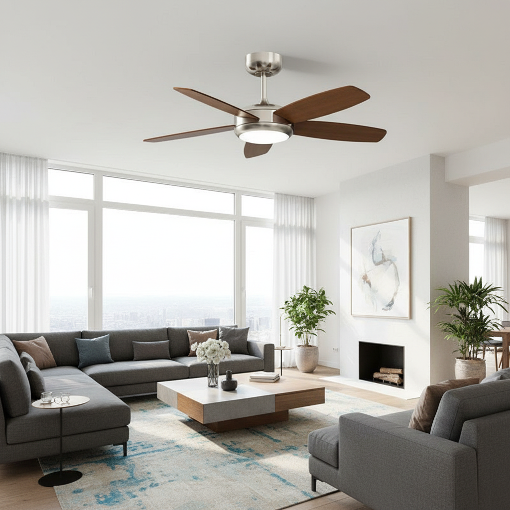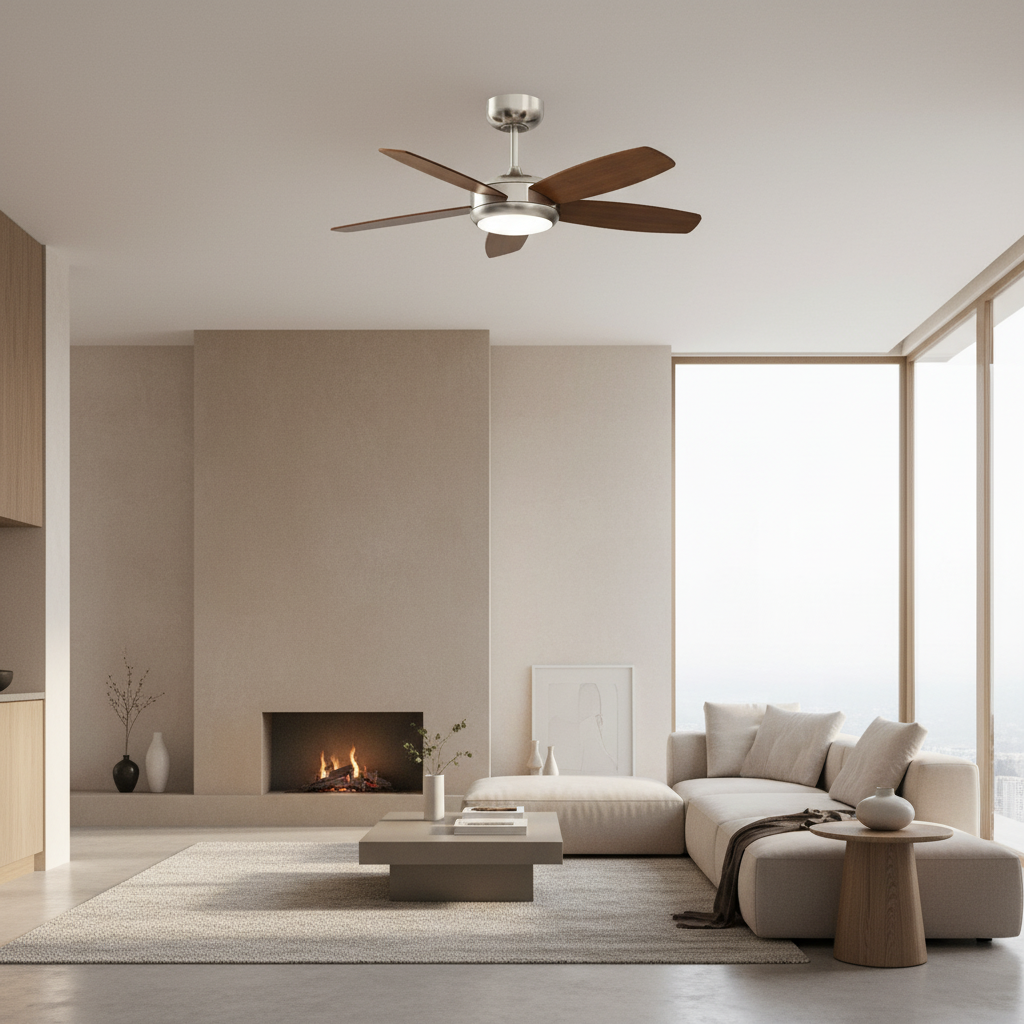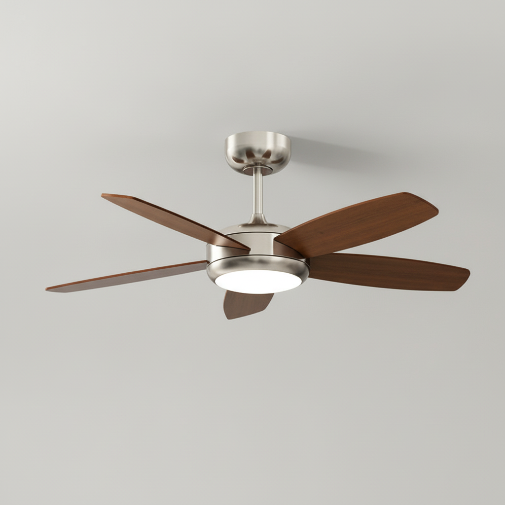 Ce lustre ventilateur arbore un style contemporain, combinant métal brossé et cinq pales en bois. Il intègre une lumière LED unique (ampoule incluse, non dimmable). Le contrôle s'effectue via un interrupteur mural tactile.- Ventilation efficace et silencieuse pour un confort optimal.