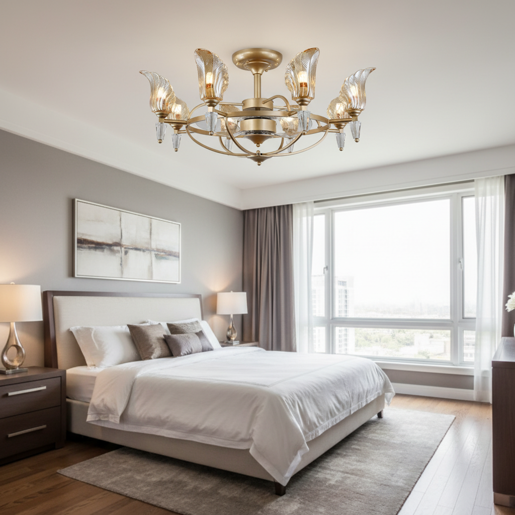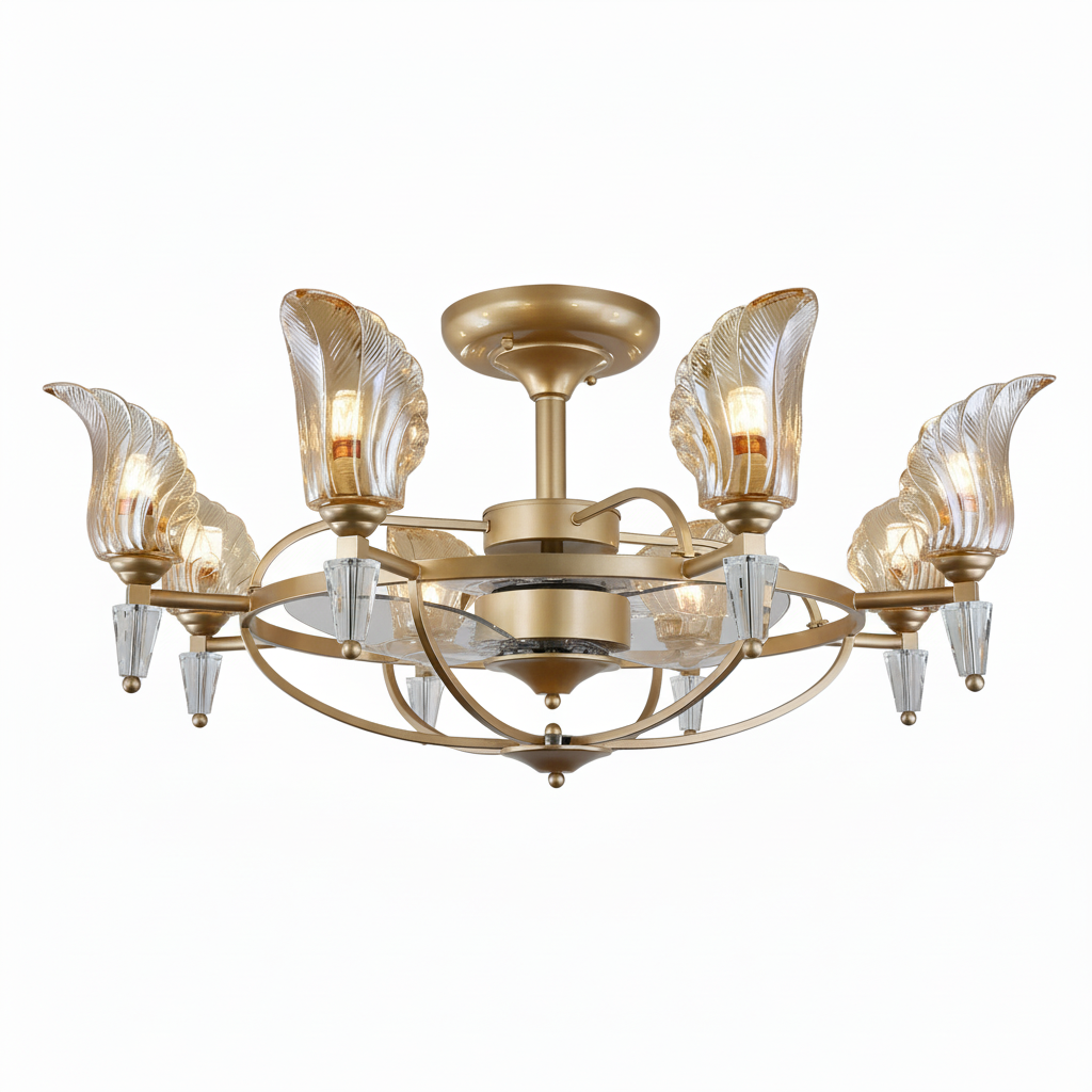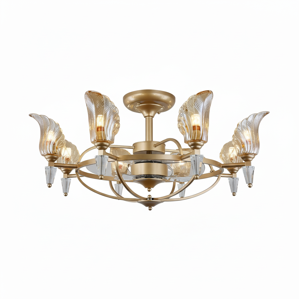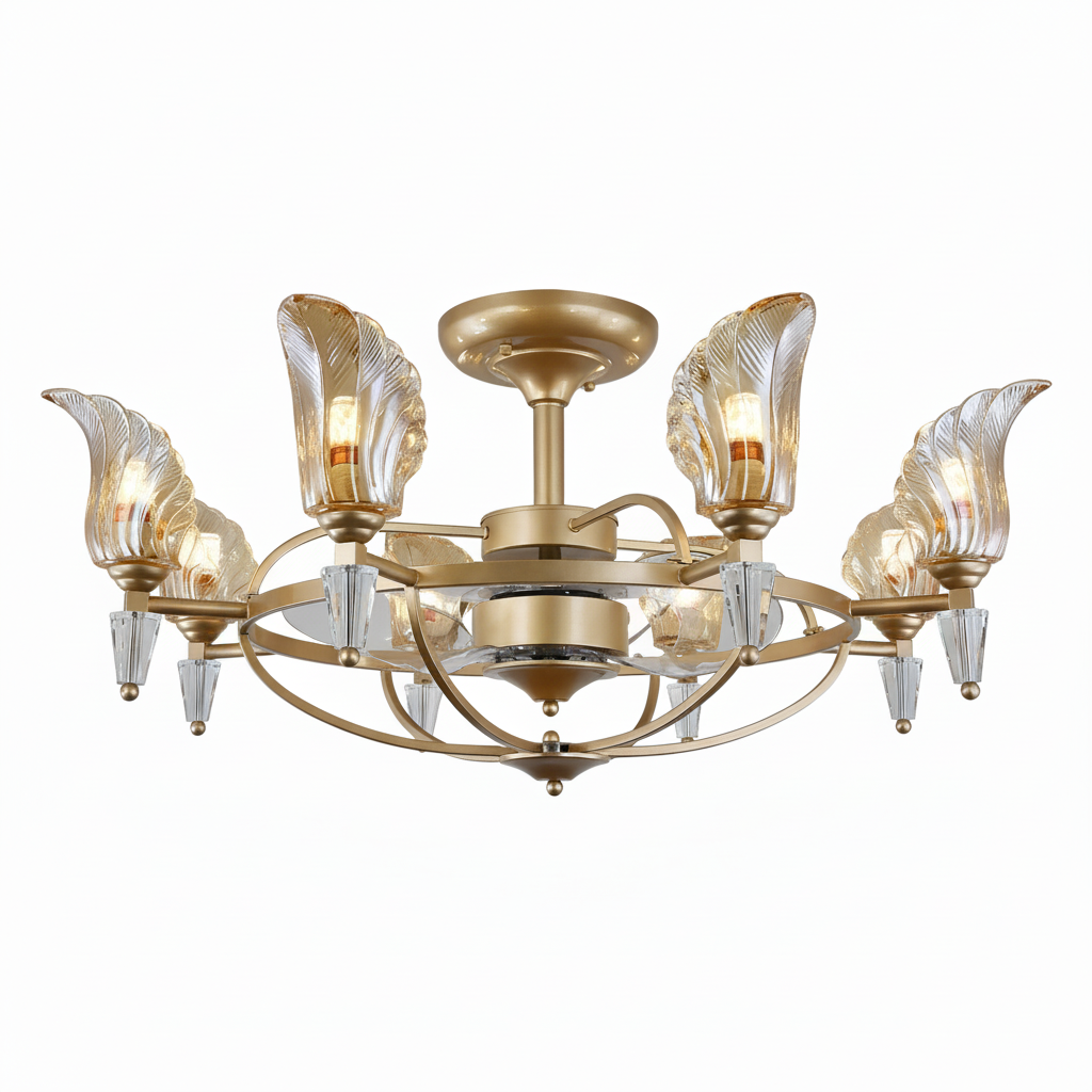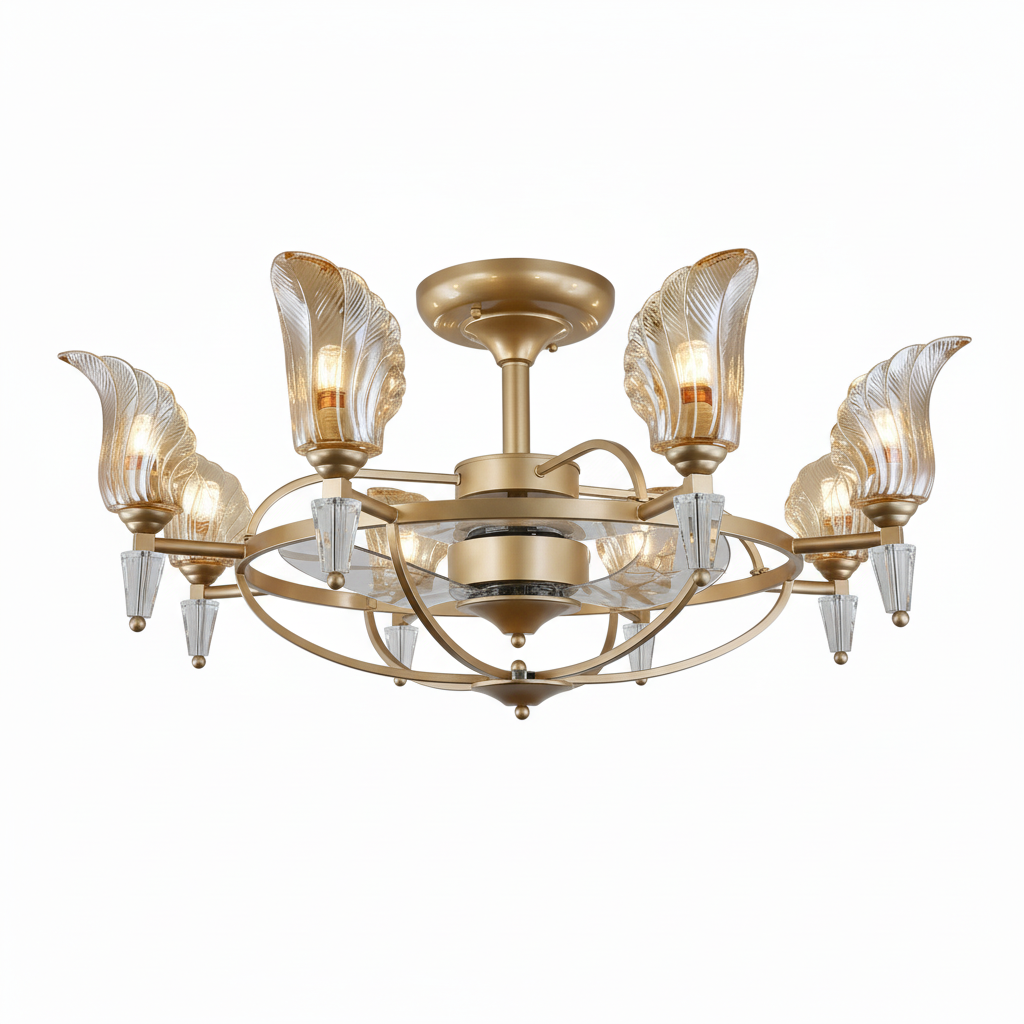 Ce lustre ventilateur offre un design contemporain avec un corps et une finition en fer. Il intègre 8 ampoules LED dimmables, procurant un flux lumineux impressionnant de 2000 à 82000 lumens. Le ventilateur, doté de pales compactes de 10-20cm, est contrôlable par télécommande pour une ventilation efficace dans vos pièces de vie.