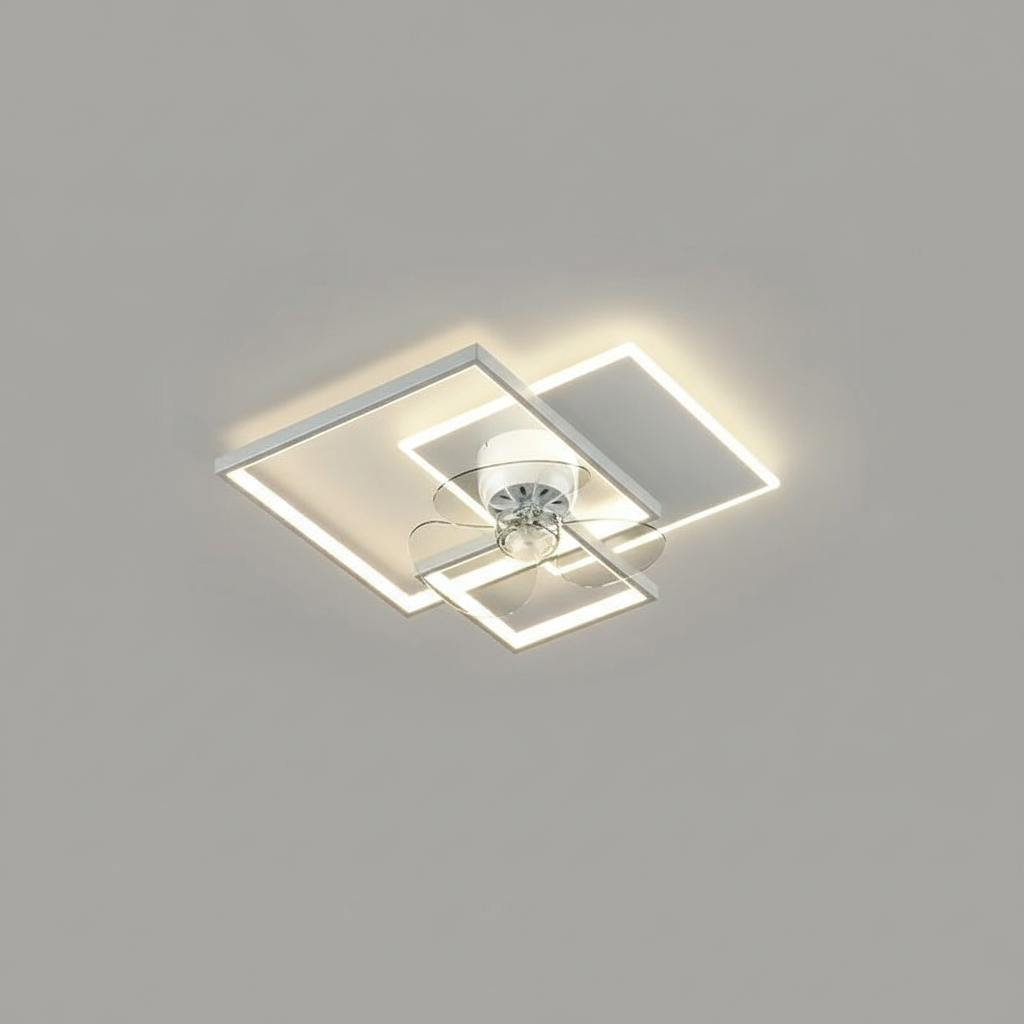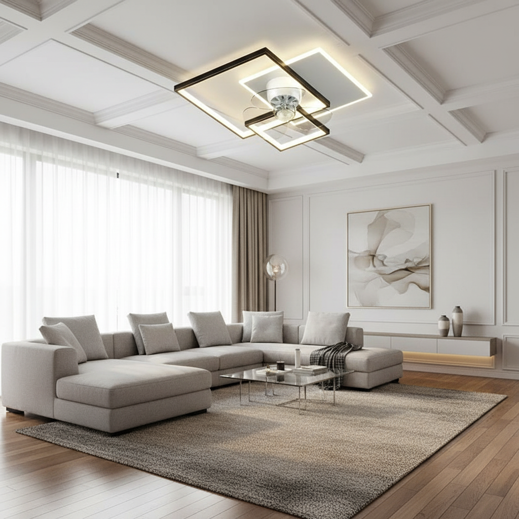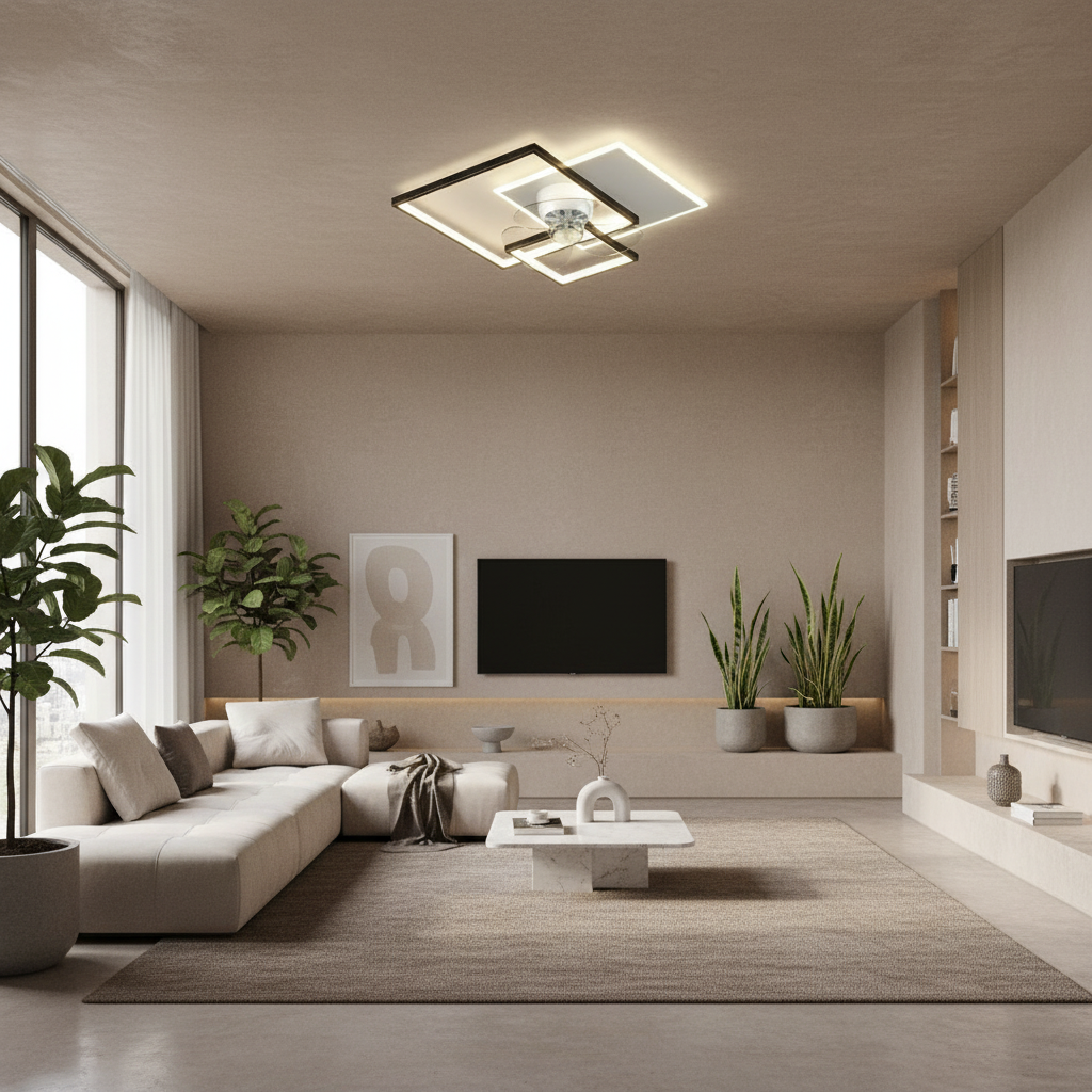 Ce modèle contemporain combine aluminium et finition fer avec éclairage LED. Ses dimensions (61x54x17 cm) conviennent à des pièces de 10 à 15 m² (salon, chambre). Il intègre 3 pales rétractables et des LED dimmables, pilotables par télécommande.