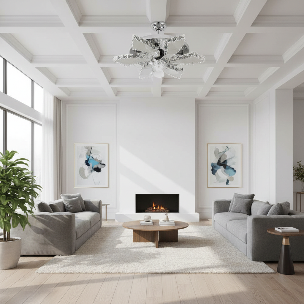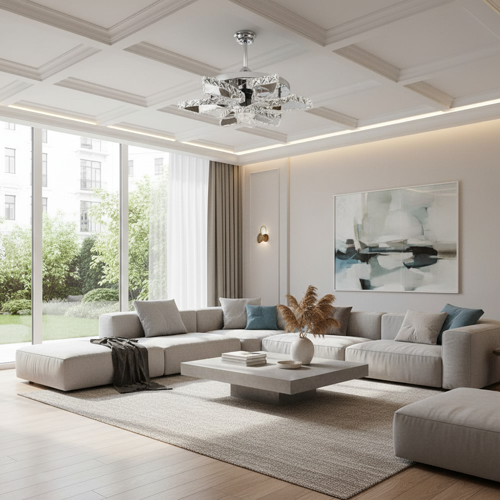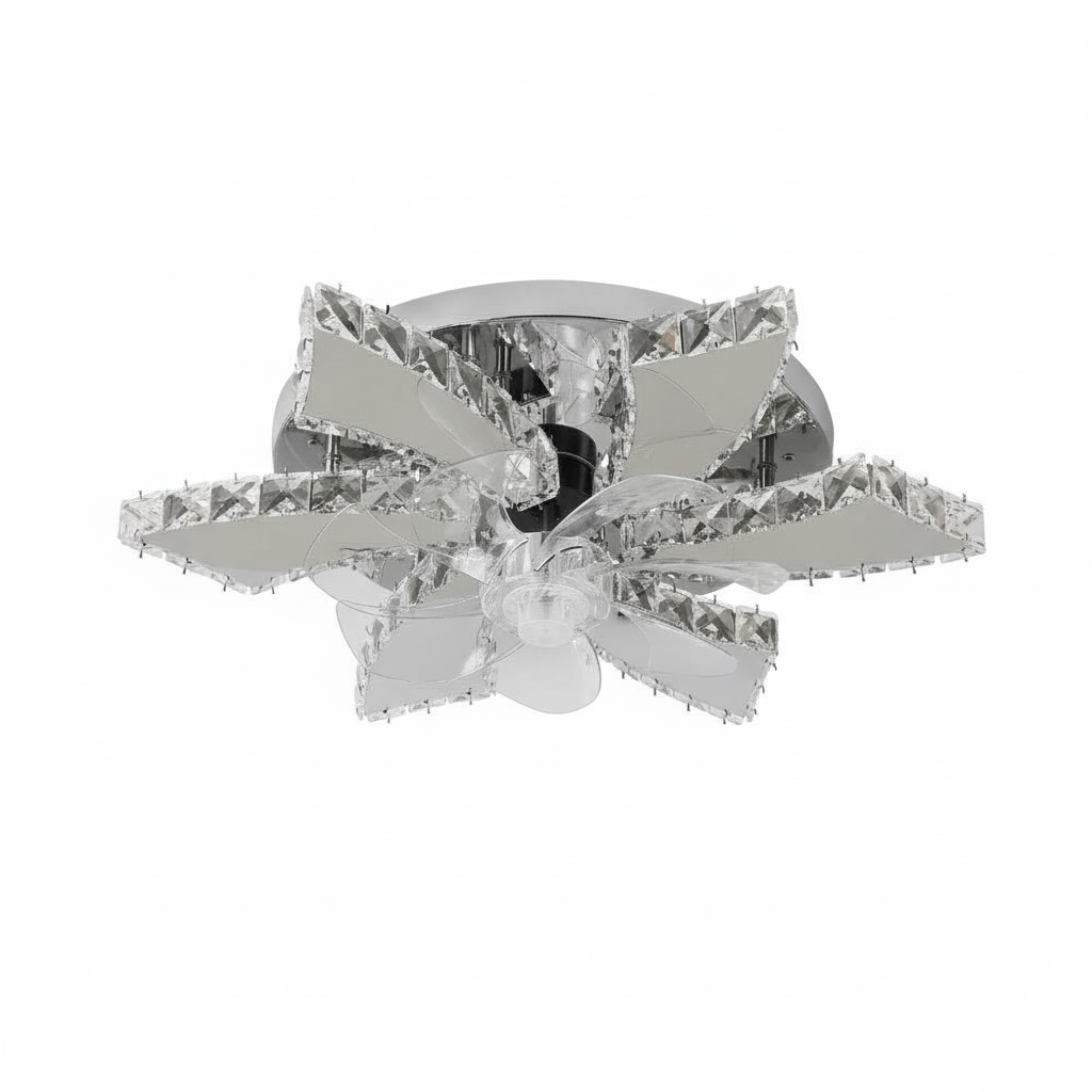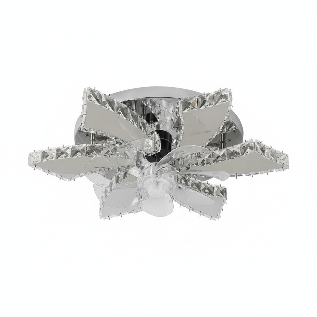 Ce ventilateur de plafond lumineux se distingue par sa conception en acier inoxydable et cristal, rehaussée d'une finition chrome. Avec un diamètre de 53 cm et une hauteur de 15 cm, il intègre un éclairage LED puissant (2x30W) et dimmable, permettant de choisir entre blanc chaud et blanc froid. Ses pales rétractables et son moteur AC offrent 6 vitesses et une fonction réversible pour une utilisation été comme hiver, le tout pilotable par une télécommande intelligente.