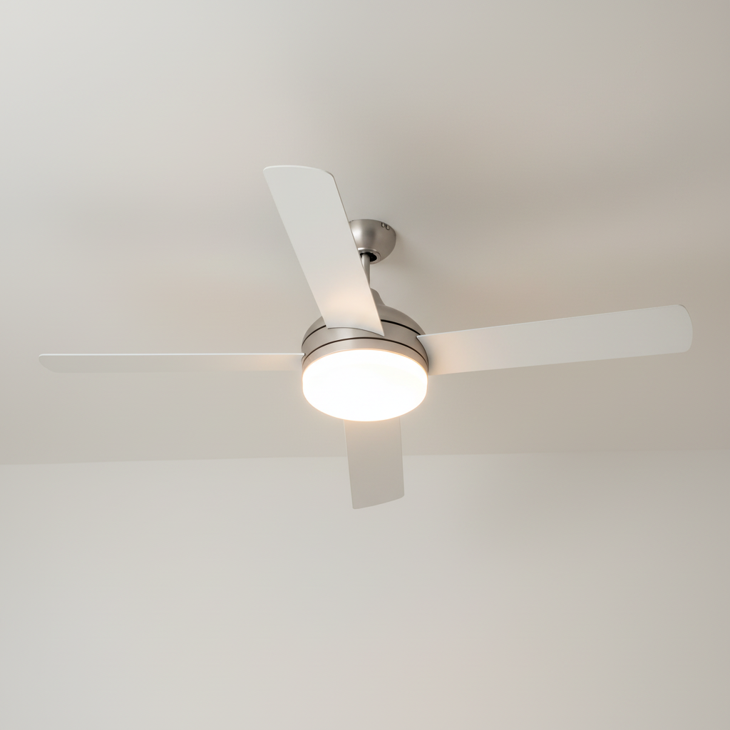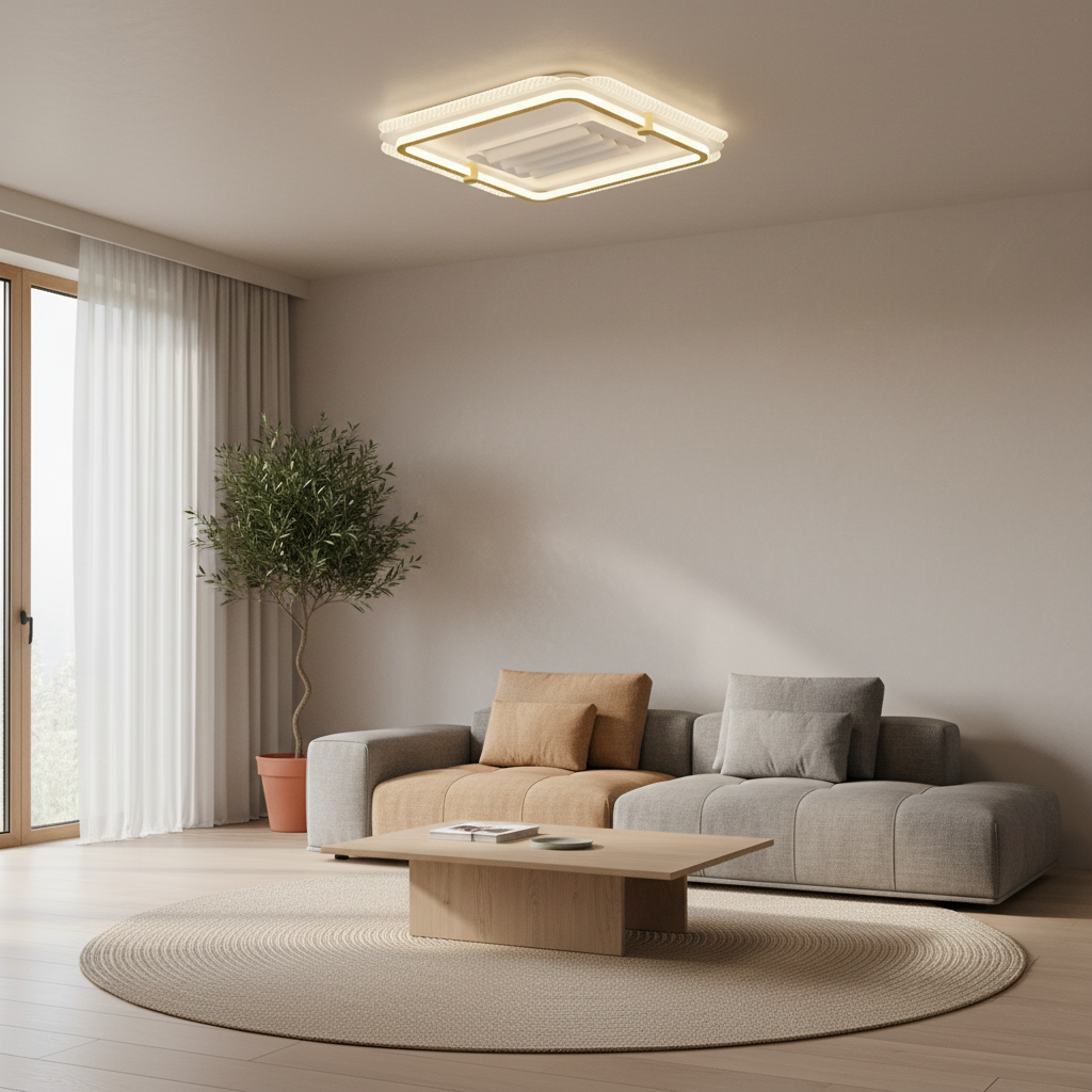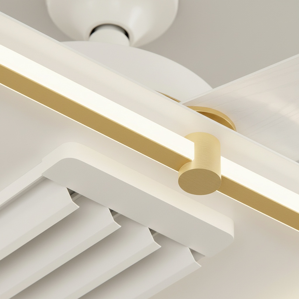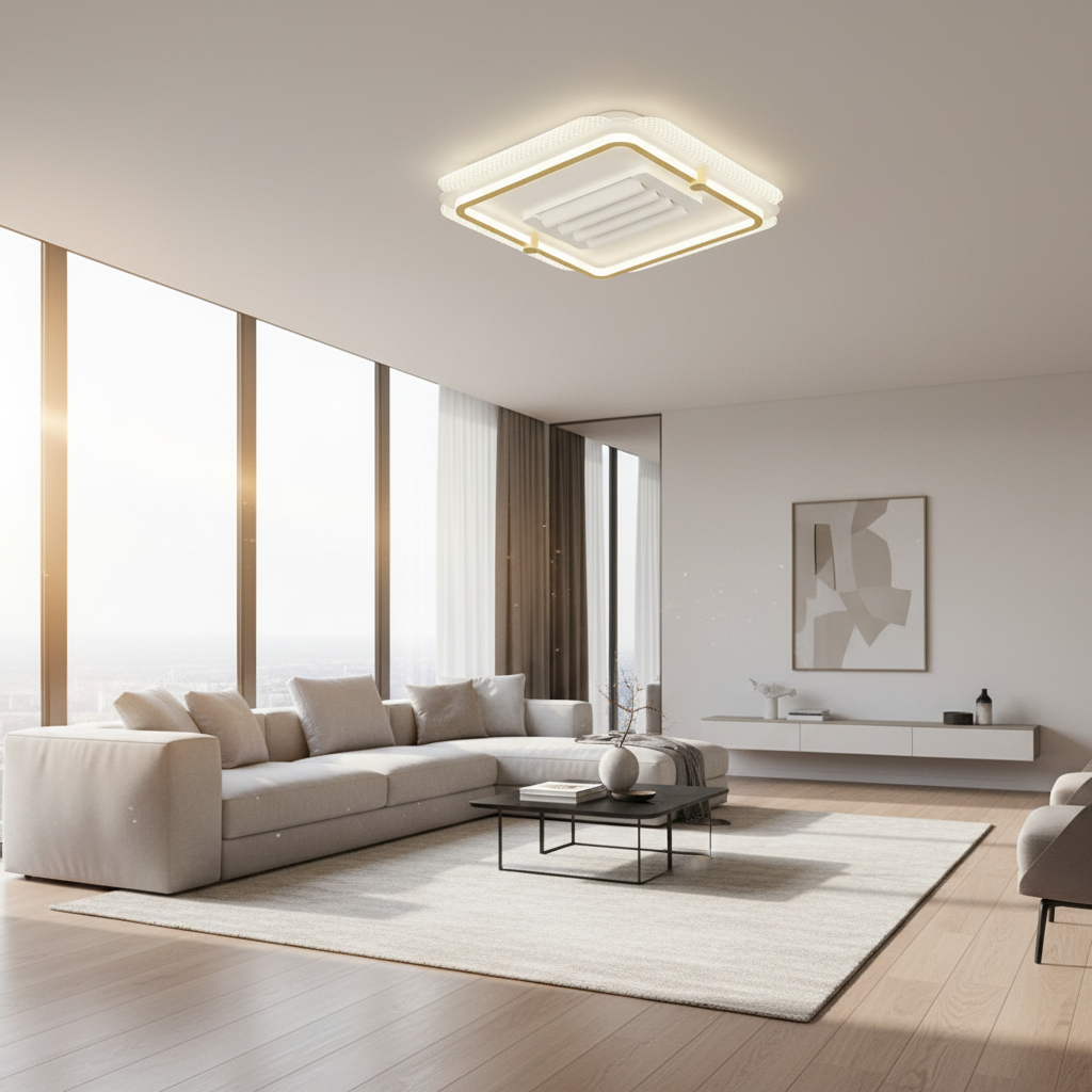 Conçu en aluminium et fer, ce lustre ventilateur combine robustesse et esthétique moderne. Il intègre un éclairage LED dimmable pour ajuster l'intensité lumineuse selon vos besoins. Ses pales se rétractent discrètement lorsqu'elles ne sont pas utilisées, transformant ce produit en un luminaire élégant. Le contrôle se fait aisément via une télécommande.- Ventilation efficace et discrète grâce aux pales rétractables.