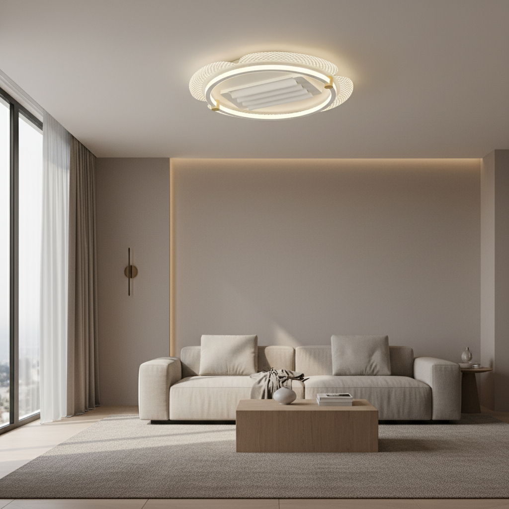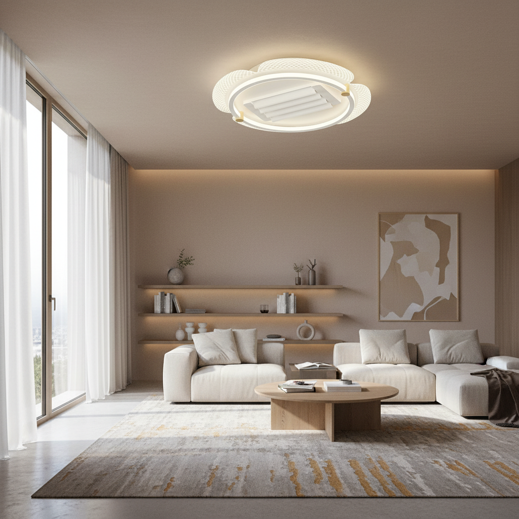 Ce lustre ventilateur combine une structure robuste en aluminium et fer avec un style moderne affirmé. Son éclairage LED intégré est entièrement dimmable, vous permettant d'ajuster l'intensité lumineuse selon vos envies. Les pales rétractables discrètement intégrées garantissent une esthétique épurée lorsqu'elles ne sont pas utilisées, et se déploient pour offrir une ventilation efficace. Contrôlez toutes les fonctions, y compris le flux d'air réversible pour les saisons, grâce à sa télécommande pratique.- Ventilation efficace et discrète grâce aux pales rétractables.