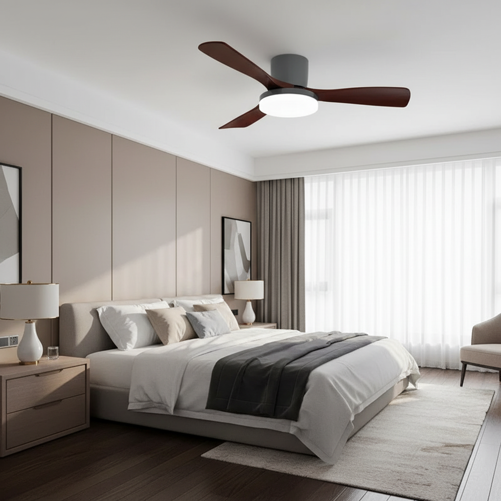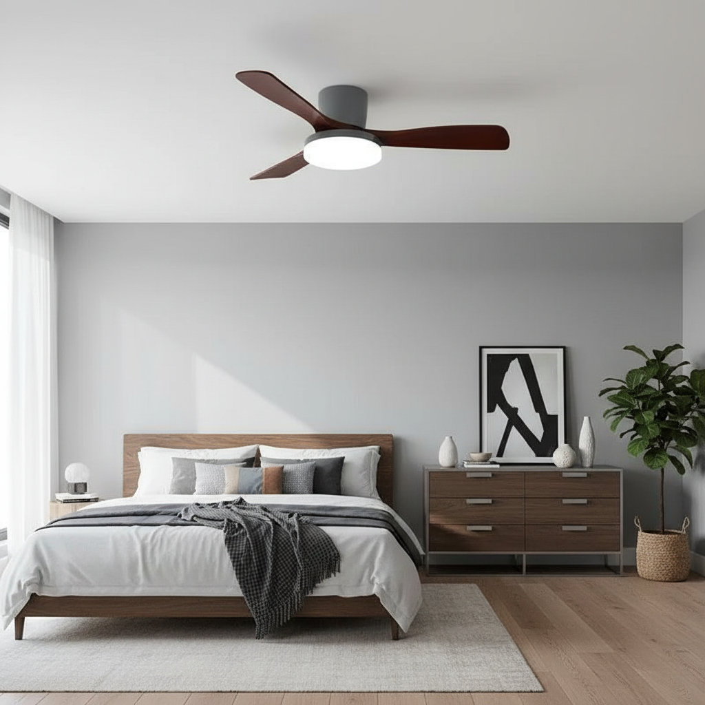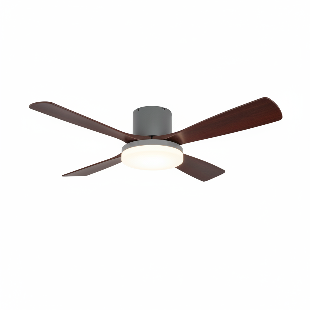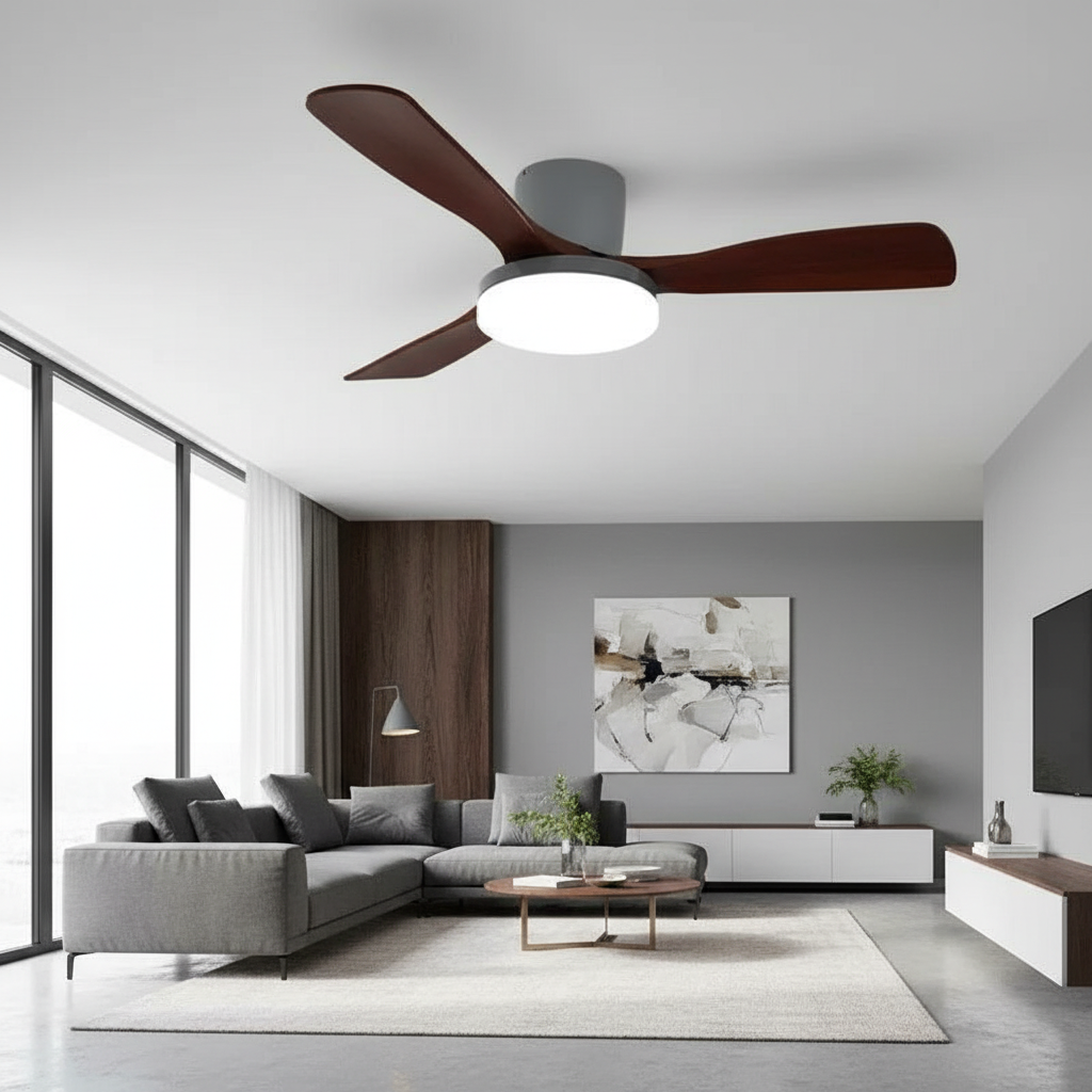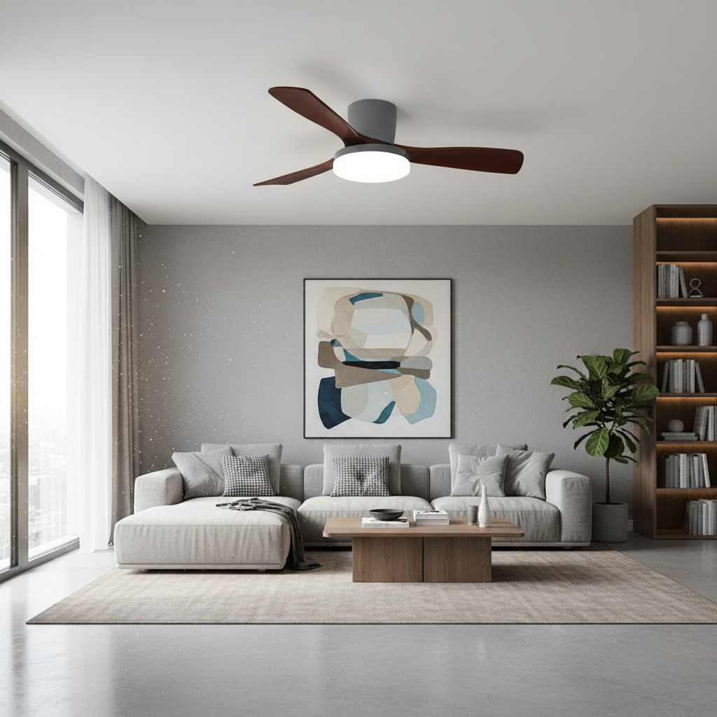Ce lustre ventilateur se distingue par son style contemporain et ses fonctionnalités avancées. Disponible en diamètres 42 et 52 pouces, il s'adapte à diverses tailles de pièces. Doté d'un moteur DC efficace et de pales en matériau ABS réversibles avec finition bois, il assure une ventilation puissante et silencieuse. L'éclairage LED intégré offre 3 couleurs de lumière et est entièrement dimmable, vous permettant d'ajuster l'intensité selon vos besoins.- Ventilation efficace avec 6 vitesses réglables par télécommande.